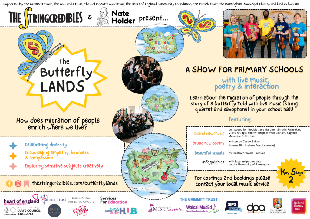 The show is an extravaganza of live music, poetry, movement and interaction, featuring original compositions, writing and illustrations. It has been developed by The Stringcredibles – a quartet of world-class musicians who are also members of the City of Birmingham Symphony Orchestra – and Nate Holder – a pro saxophonist and specialist in decolonising the curriculum. We feature data and infographics relating to migration in the West Midlands, specially put together for us by academics at the University of Birmingham.